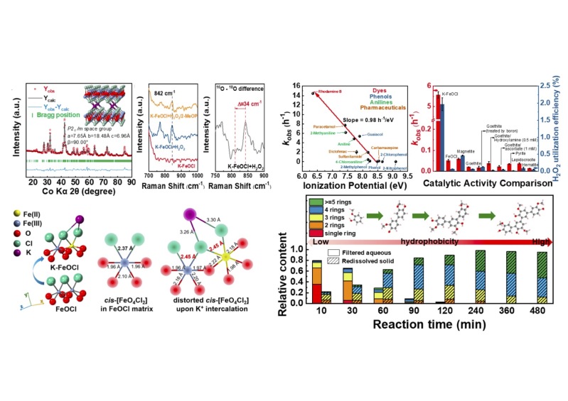 氧氧键活化产生活性氧物种的过程受多相界面金属配位环境影响显著,是生物有氧氧化、自然界氧化还原作用、酶催化和精细选择性氧化的核心微观过程之一。人们利用仿生大环配体,界面金属载体强相互作用,沸石、碳基或硅基骨架限域作用等发展了诸多高效催化氧化体系。2013年,我校相关团队发展了FeOCl这一高效多相Fenton催化剂(J. Am. Chem. Soc. 2013,135, 43, 16058–16061),高效催化过氧化氢均裂产生羟基自由基。此次,借助FeOCl结构性Cl···Cl范德华层的特殊存在,研究人员通过氧化还原插层,在范德华层间引入碱金属离子,调控FeOCl的铁配位中心微环境,通过插层前体、插层时间等因素的精准优化,在钾离子插层的情况下获得了一种全新的畸变顺式双核FeO4Cl2固相铁配位构型,并通过X射线衍射精修、X射线光电子能谱、穆斯堡尔谱、原位紫外可见光谱、原位拉曼光谱等多种手段在原子尺度解析了上述结构演变过程和新构型下过氧化氢活化路径的切换。过氧化氢异裂产生Fe(IV)=O非自由基活性物种,可诱导染料、药物、酚、胺类多种有机物的氧化偶联腐质化过程,将溶解态有机污染物转变为颗粒絮体,结合过滤可实现有机污染物和总有机碳的高效去除,偶联速率与底物的离子化能存在线性关系。研究团队还通过同位素KIE测试、电子顺磁共振证明了反应过程中涉及底物在K-FeOCl表面的质子耦合电子转移和液相主体中的自由基偶联过程。