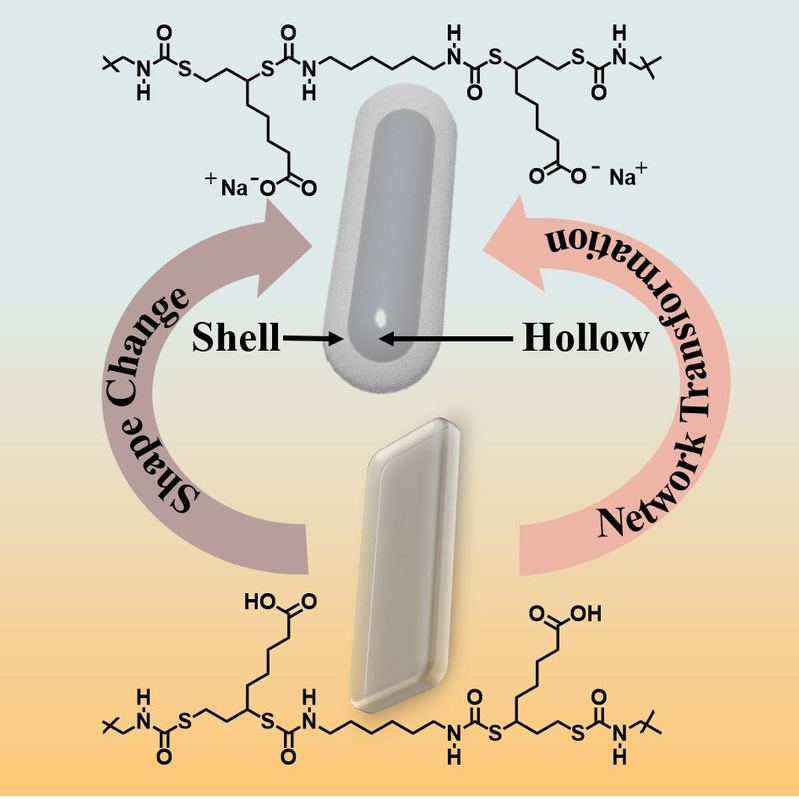 该聚合物材料由硫辛酸开环后的6,8-二巯基辛酸为原料与六亚甲基二异氰酸酯在碱催化条件下制备而成。聚合物网络内高密度的氢键赋予材料优异的机械性能,通过与铁离子的配位键的引入进一步强化网络,增强聚合物的机械性能。无配位键的干网络聚合物薄膜浸泡在氢氧化钠溶液中,分子内部分羧酸基团反应为可以形成离子键的羧酸钠。聚合物从初始的氢键交联网络逐渐转换为氢键和离子键两种交联形式共存的网络,交联形式的转换诱导聚合物形状从固态薄膜逐渐演化为规整的空心结构,演化后的聚合物仍拥有较强的机械性能。简单编辑初始的二维聚合物薄膜的形状并将其浸泡在碱溶液中,可以演化形成相应的三维中空模型。该工作提出的空心结构自演化的策略在软体机器人、刺激释放容器以及特殊组件连接器等新型智能材料领域有着潜在的应用前景。