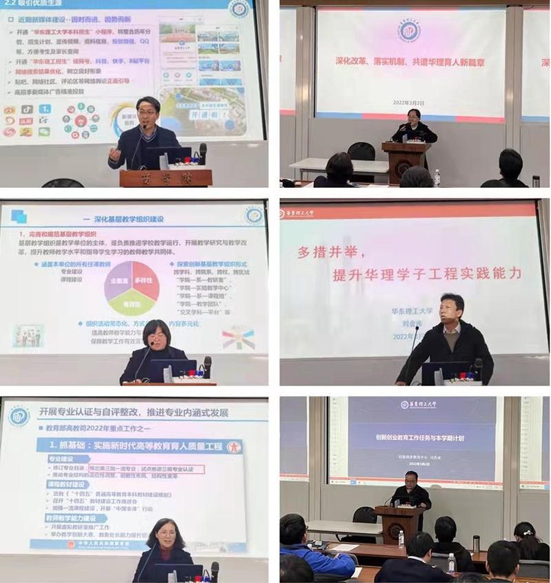教务处副处长万永菁作了题为“深化改革、落实机制、共谱华理育人新篇章”的报告。她提出,今年将按照教育部高教司2022年规划的重点工作“抓基础——实施新时代高等教育育人质量工程”要求,从学科专业、课程、教材、教师等方面入手提高育人质量。今年,我校将继续深化教育教学改革,多措并举完善人才培养模式,积极推动项目式教学改革立项建设;坚持“以学生为中心”的理念,依据“新工科”“新文科”人才培养理念与要求,系统梳理专业知识逻辑体系,探索以项目为链条的教学模式,优化人才培养全过程,关注人才培养成效和学习成果,以培养能够面向未来新科技和新经济发展需要,具有制造、发现、创新思维等素养的综合性人才。