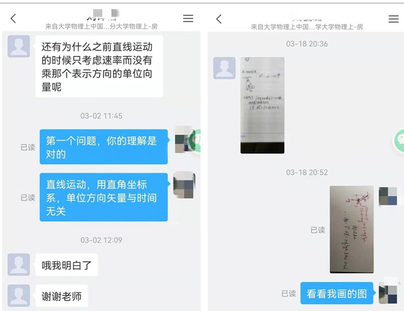“第一时间回复同学的问题,特殊情况最迟当天完成。”这是房毅对学生的承诺。多年来,他通过“学习通”、微信等平台持续为学生提供“无缝衔接”的线上答疑。疫情之下,这种答疑方式更让学生感到老师们一直在身边。对于健康观察的同学,房毅更是关心备至,从线上学习、线下答疑到作业的完成,都事无巨细地一一落实,使学生感到仍然身处于集体之中,和同学、老师一道在学习。