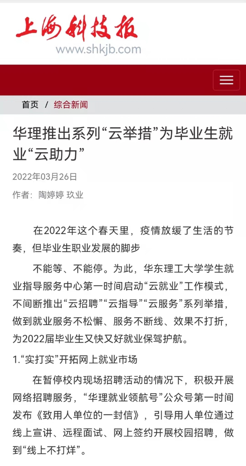 【上海科技报】华理推出系列“云举措”为毕业生就业“云助力”