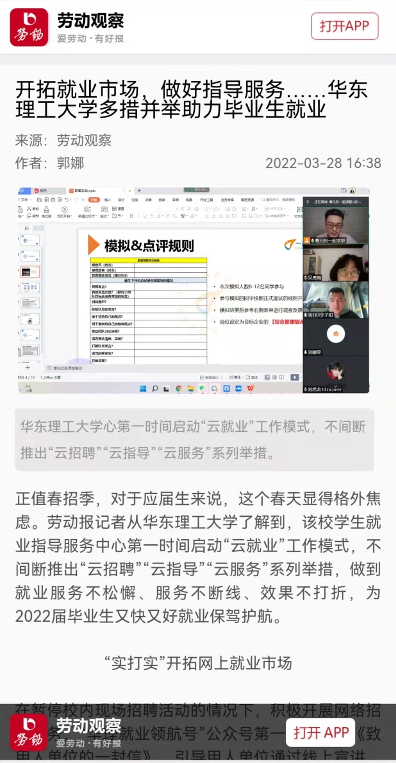 闭环管理期间,学工部学生就业指导服务中心第一时间启动“云就业”工作模式,不间断推出“云招聘”“云指导”“云服务”系列举措,做到就业服务不松懈、服务不断线、效果不打折,为2022届毕业生又快又好就业保驾护航。文汇APP、中国新闻网、新民晚报客户端、劳动观察、第一教育、上海科技报、话匣子等多家媒体进行了报道。本篇选取了部分报道予以转载。
