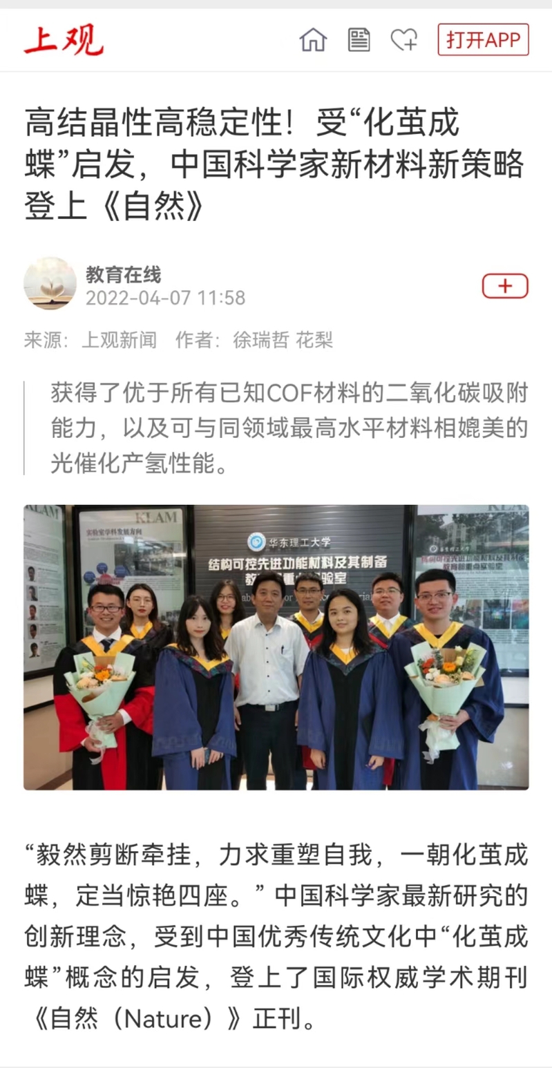 【上观新闻】高结晶性高稳定性!受“化茧成蝶”启发,中国科学家新材料新策略登上《自然》