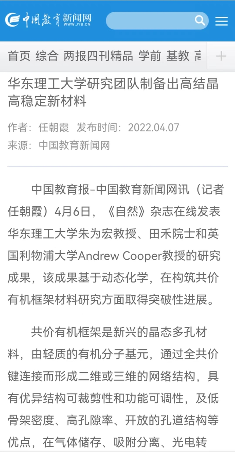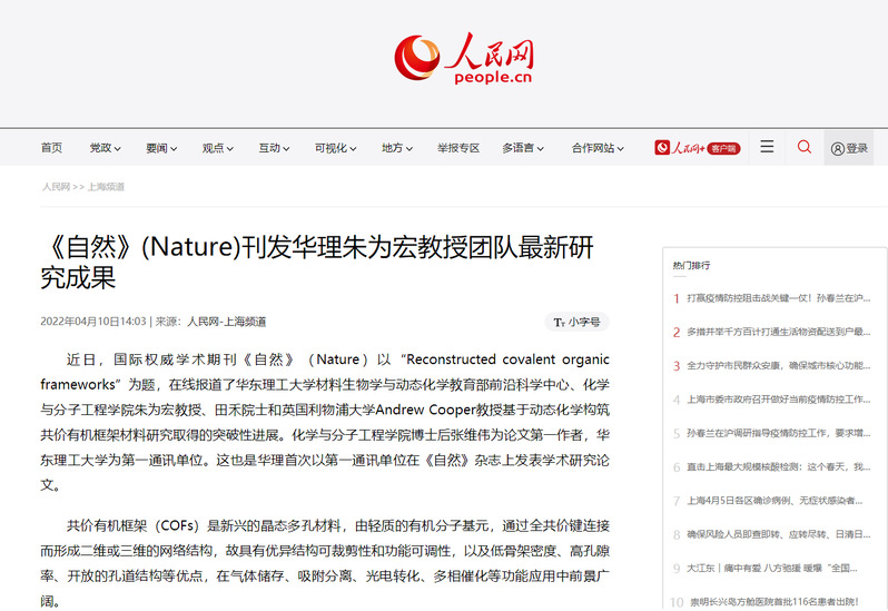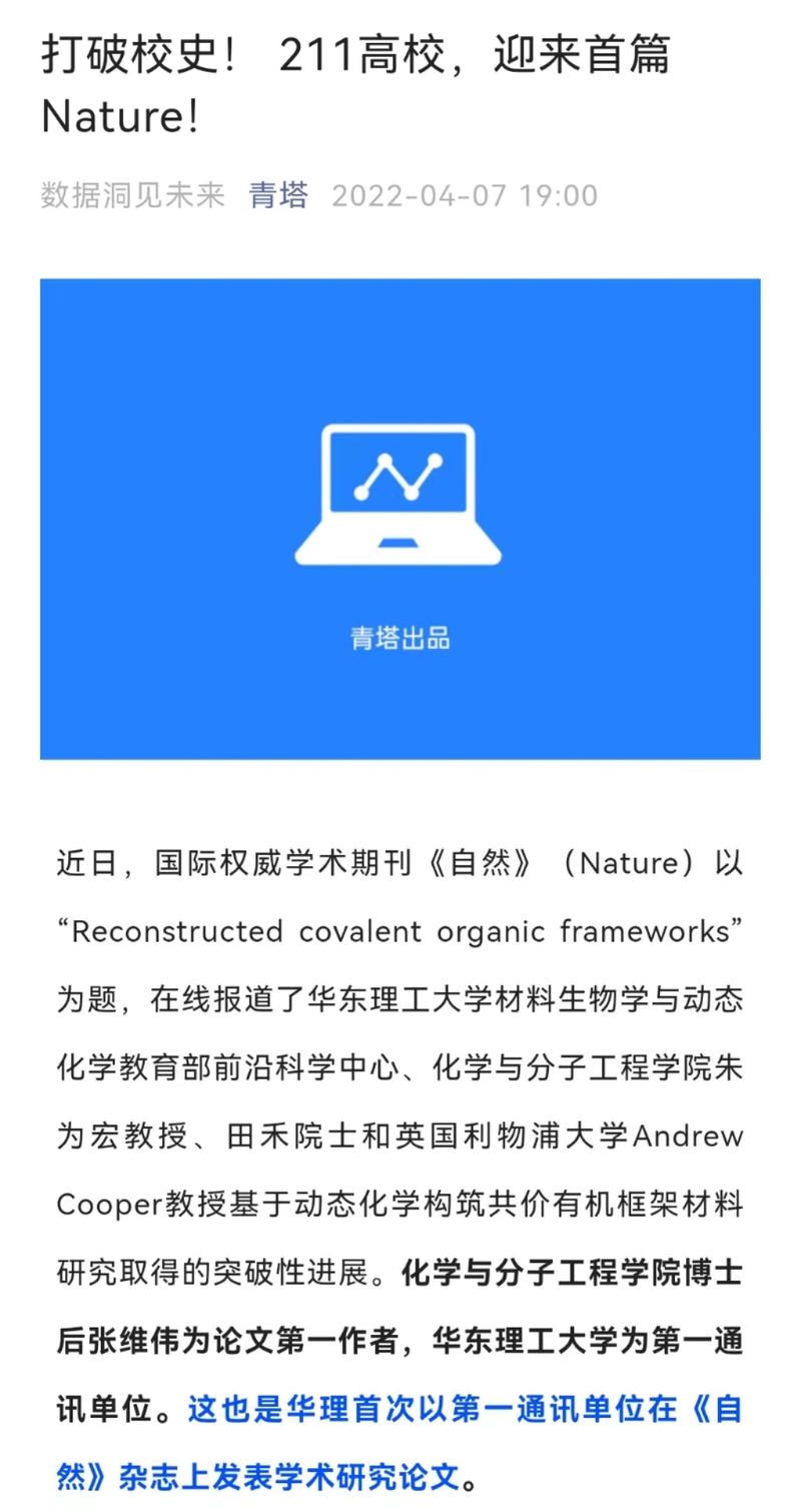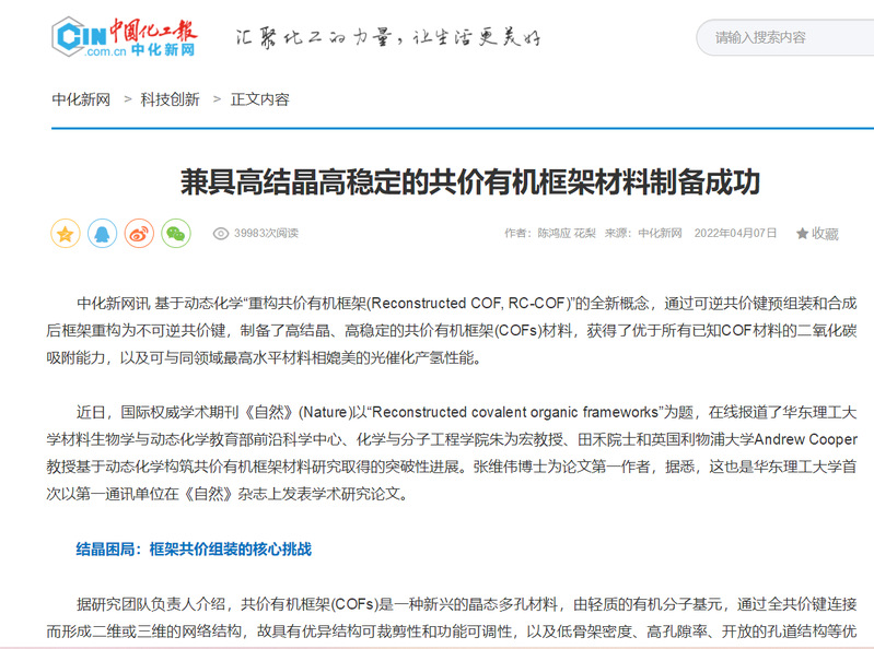 近日,国际权威学术期刊《自然》在线报道了我校材料生物学与动态化学教育部前沿科学中心、化学学院朱为宏教授、田禾院士和英国利物浦大学Andrew Cooper教授基于动态化学构筑共价有机框架材料研究取得的突破性进展。这也是华理首次以第一通讯单位在《自然》杂志上发表学术研究论文。《中国科学报》、人民网、中国教育新闻网、光明日报客户端、上观新闻、中国新闻网、青塔、中化新网、新民周刊、第一教育、上海科技报、周到上海、话匣子等多家主流媒体原发报道近20条。本篇选取了部分报道予以转载。