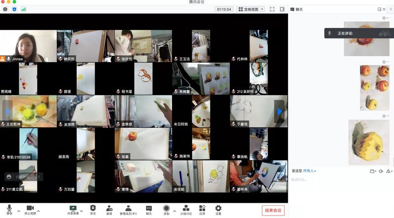 用画笔蘸取颜料,不时地在画作上涂抹勾勒,中间还穿插着2~3轮的逐一点评,说着比平时上课多3~4倍的话——每次授课,金一的这个状态都要保持4个小时左右。“希望同学们在这个别样的‘课堂’中学有所获,这是我最开心的事。”金一表示。