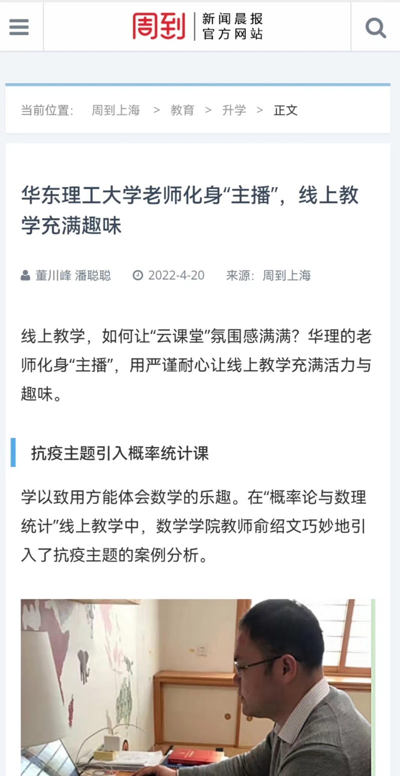 学以致用方能体会数学的乐趣,在“概率论与数理统计”线上教学中,数学学院教师俞绍文巧妙地引入了抗疫主题的案例分析。