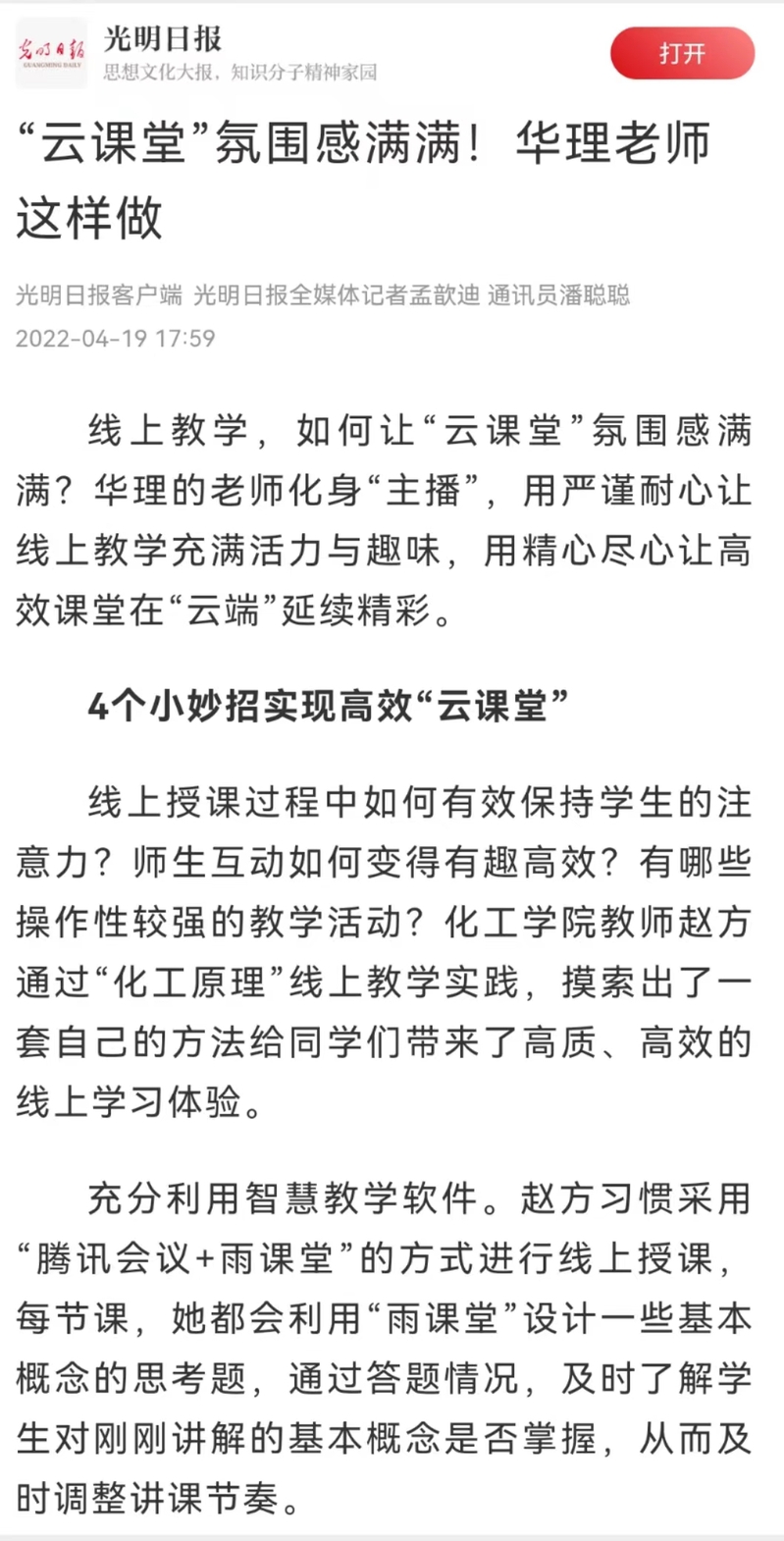“感觉自己就像‘坐在教室第一排’,可以清晰地看到老师讲授的内容,还能通过答题、发送即时消息等方式被老师随时关注到。”“化工原理”线上课程学生何思园表示:“赵方老师通过腾讯会议和‘雨课堂’进行互动教学,双管齐下,即便是网课,我们也能高效率地学习,非常棒!”