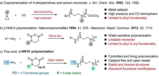 天然多肽具有重要生物学功能,但结构不稳定和易被蛋白酶水解等缺点限制多肽的功能和应用。多肽模拟物可以针对性地应对这一挑战,因而在药物发现、组织工程等诸多领域具有重要应用。前期,刘润辉教授课题组建立了对水分不敏感的β-NTA(β-氨基酸N-硫代羧基酸酐)聚合新方法,解决了β-内酰胺聚合制备β多肽这一经典合成方法对水分敏感、聚合条件苛刻、功能基团受限的核心挑战(Angew.Chem. Int. Ed. 2020, 59, 7240-7244)。