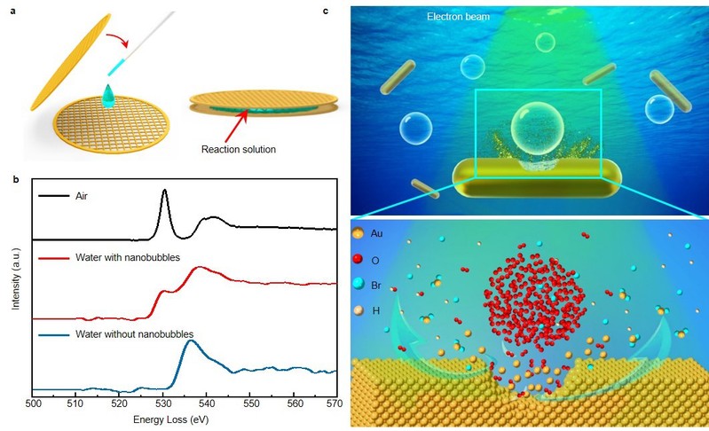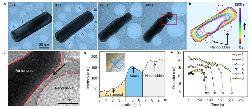 孙立涛教授团队利用电子束辐解水产生氧气气泡,首次构建并实时观察了溴化氢水溶液中,氧气气泡刻蚀金纳米棒的固-液-气三相反应(如图1所示)。实验观测发现,当金纳米棒周围没有纳米气泡时,该纳米棒逐渐被氧化刻蚀演变成表面光滑的椭球形并最终消失,但当金纳米棒周围存在纳米气泡时,靠近纳米气泡位置的纳米棒会被加速刻蚀,并演变成局部凹陷的结构。值得指出的是,当发生局部凹陷时,纳米棒和纳米气泡并非是直接接触的,二者之间存在超薄液膜(如图2所示)。从大量实验结果定量分析可知,仅当纳米气泡与固体之间的距离小于临界尺寸(~1nm)时,刻蚀速率才显著提升(一个量级以上),否则,刻蚀速率几乎不变。