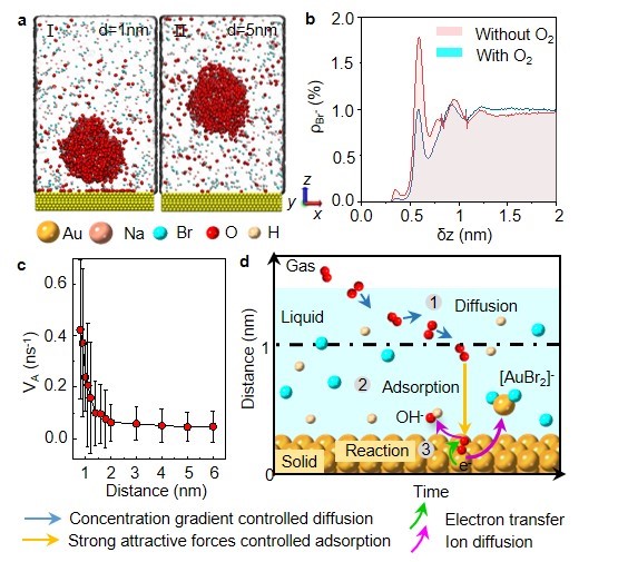 方海平教授团队利用经典分子动力学和第一性原理分子动力学模拟指出,纳米气泡的存在并未影响溴离子在金纳米棒的表面的吸附位置,而纳米气泡中释放的氧气分子在金纳米棒表面吸附是加速反应的关键。当纳米气泡与金纳米棒表面之间液层的厚度大于~1nm时,纳米气泡所释放的氧气分子通过浓度梯度主导的扩散穿过液层到达金纳米棒表面,此过程速度较慢。但当纳米气泡与金纳米棒表面之间液层的厚度减小到~1nm以内时,氧气分子的输运过程具有“类遂穿”效应,氧气分子以极高速度穿过液层吸附到金纳米棒表面,从而极大地加速了刻蚀反应。