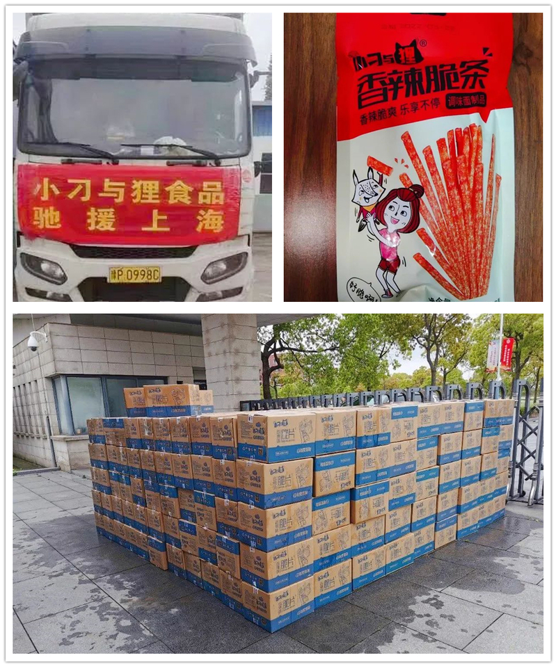 上海穗华园食品有限公司得知学校闭环管理期间,学生渴望吃到零食,第一时间协调联系小刁与狸食品有限公司,经过2天2夜的运输,将500箱辣条从广东省运至上海,赠予校内学生。