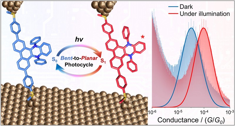 一般来说,共轭发光分子在短波长光的持续照射下,会连续不断的发射出长波长光,这归因于光照下的共轭分子在基态和激发态之间存在分子构型/电子云排布的互变循环过程。同时,共轭分子的电导性也与共轭路径和电子云排布密切相关。因此,基态和激发态之间的光循环过程是可以引发分子光电导信号。但是,由于纳米级检测技术和经典模型分子的缺失,使得一直无法有效探究激发态分子骨架演变与光电导之间的构效关系。为了深入研究这一过程,田禾院士团队通过修饰DPAC分子,借助扫描隧道显微镜裂结(STM-BJ)技术,成功构建单分子器件。在340nm紫外光的持续照射下,器件的统计电导提升至初始值的3倍,是已报道单分子器件的最高光电导数据。理论计算表明,光诱导的分子结构弯曲-平面化循环过程导致电子分布显著变化,从而引起Fano共振,并产生光电导。此工作不仅提出了光电导单分子器件的构建新策略,还为理解有机共轭分子基态与激发态之间的光循环过程提供了全新视角。