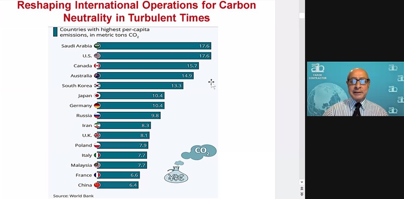 会议邀请国际商务学会(AIB)主席、罗格斯大学商学院管理和全球商务讲席教授Farok J. Contractor作主题报告。Farok J. Contractor教授聚焦跨国公司碳中和背景下面临的挑战,分析全球碳排放面临的问题,提出碳中和解决方案,并针对企业达到碳中和所面临的新挑战给出了建设性意见。