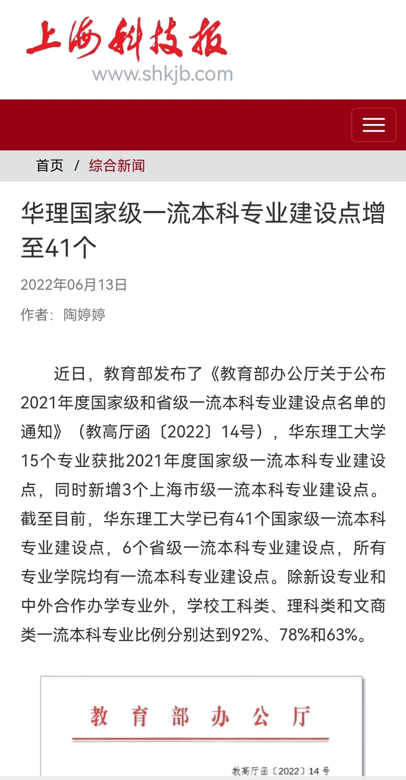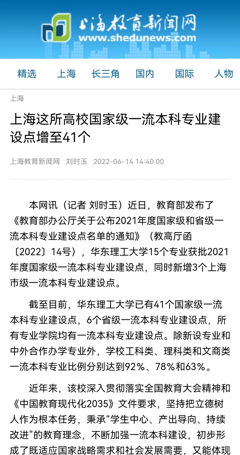 【上海科技报】华理国家级一流本科专业建设点增至41个