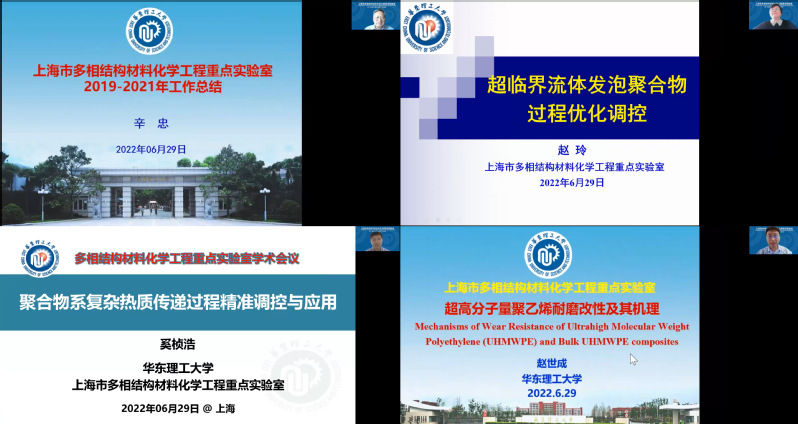 会上,朱为宏致欢迎词,介绍了学校和重点实验室的基本情况,肯定了实验室近年来的建设成果,并欢迎学术委员会专家对实验室工作多提宝贵意见。重点实验室主任辛忠作实验室工作报告,汇报了2019-2021年度实验室研究成果、队伍建设、合作交流等方面情况。实验室主要学术骨干赵玲教授、奚桢浩教授、赵世成教授分别作了题为“超临界流体发泡聚合物过程优化调控”“聚合物体系复杂热质传递过程的精准调控与应用”和“超高分子量聚乙烯耐磨改性及其机理”的学术报告,介绍了实验室近年来的代表性研究成果。