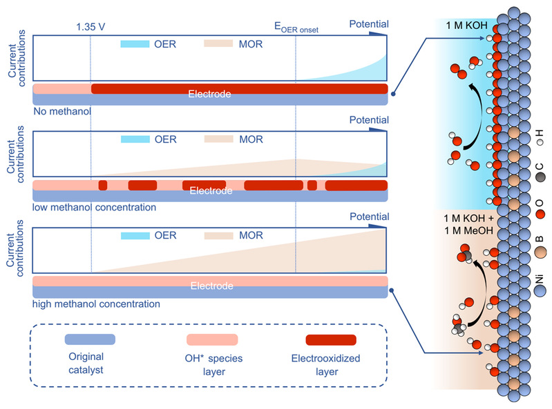 该工作以甲醇氧化反应作为模型反应来研究亲核氧化反应中涉及的共性问题。原位电化学阻抗谱和原位拉曼光谱的结果表明,析氧反应(OER)过程中,镍基催化剂表现出了明显的电氧化现象,并形成了高价NiOOH氧化物;而在高浓度甲醇的催化氧化过程中,并不伴随催化剂电氧化现象的出现。团队成员利用原位表征研究不同浓度甲醇的氧化反应过程时发现,甲醇对于催化剂电氧化形成高价电氧化产物的过程具有抑制作用,进而提出高浓度甲醇存在时催化剂表面的亲电含氧物种(O*或OH*)是甲醇氧化的催化活性物种;当甲醇浓度低时,甲醇分子向亲电含氧物种供氢变慢,对催化剂自身电氧化抑制能力减弱,催化剂电氧化所形成的高价NiOOH产物以及亲电含氧物种共同被认为是低浓度甲醇氧化的催化活性物质。研究人员进一步通过表面增强原位红外光谱明确反应中间体,并指导密度泛函理论计算以深入理解催化剂具有高效催化性能的原因。该工作对于反应过程和反应机制的认识可以进一步延伸到其他有机物的电催化亲核氧化反应中。