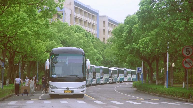 6:20,化学学院、材料学院的同学们乘坐的第一批次客运大巴和装运行李的货车一路无阻,鱼贯驶进徐汇校区东门。