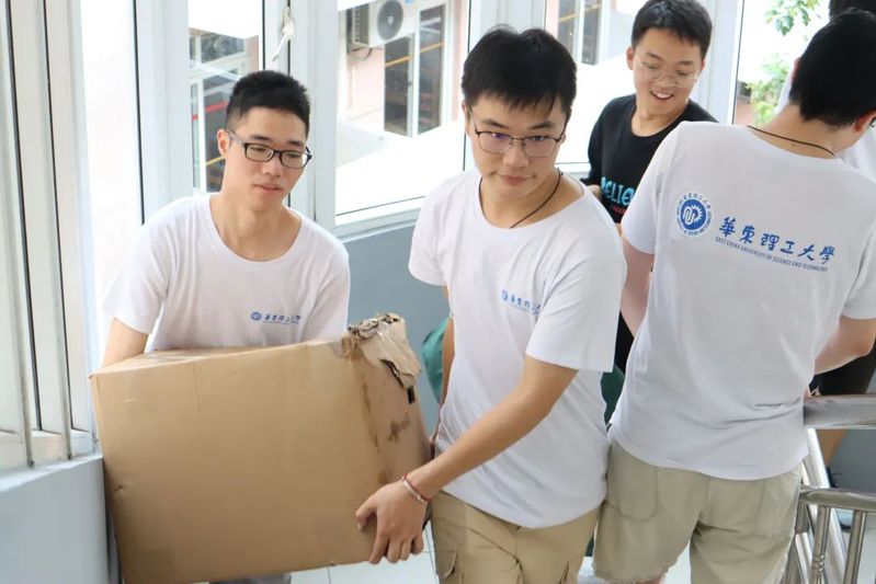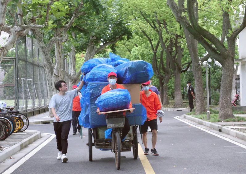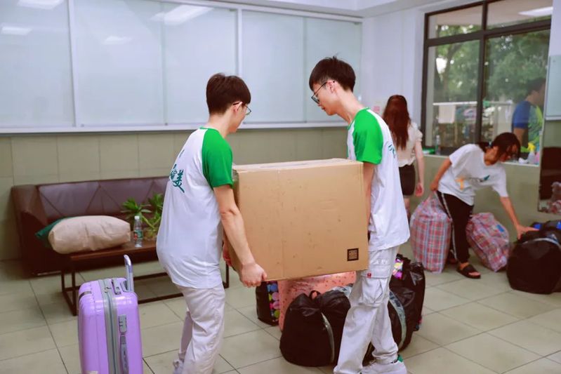 在徐汇校区,学校在宿舍楼门口竖起了欢迎牌迎接同学们,搬迁现场,暖心与温情随处可见。身着橙色外套的搬运工师傅骑着“爱心搬运车”,把行李搬上搬下,穿梭在楼宇之间。班导师、辅导员和宿管人员一起,调度安排、全程参与。后保处贴心地准备了姜茶、大麦茶,校医院安排的医护人员带着常用药物在两校区定点执勤。同学们互相帮助,学院组织的志愿者队忙前忙后,大家搬的搬、拿的拿、扛的扛,刚卸下的行李不一会儿就“消化”进了宿舍楼。