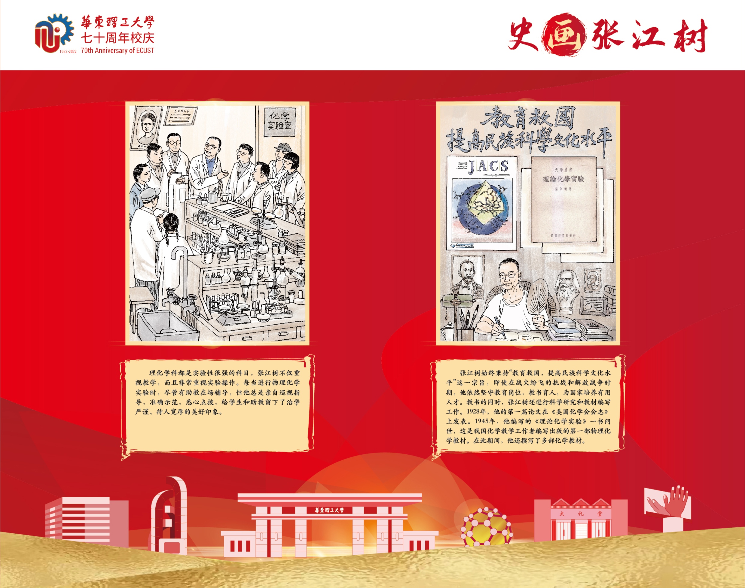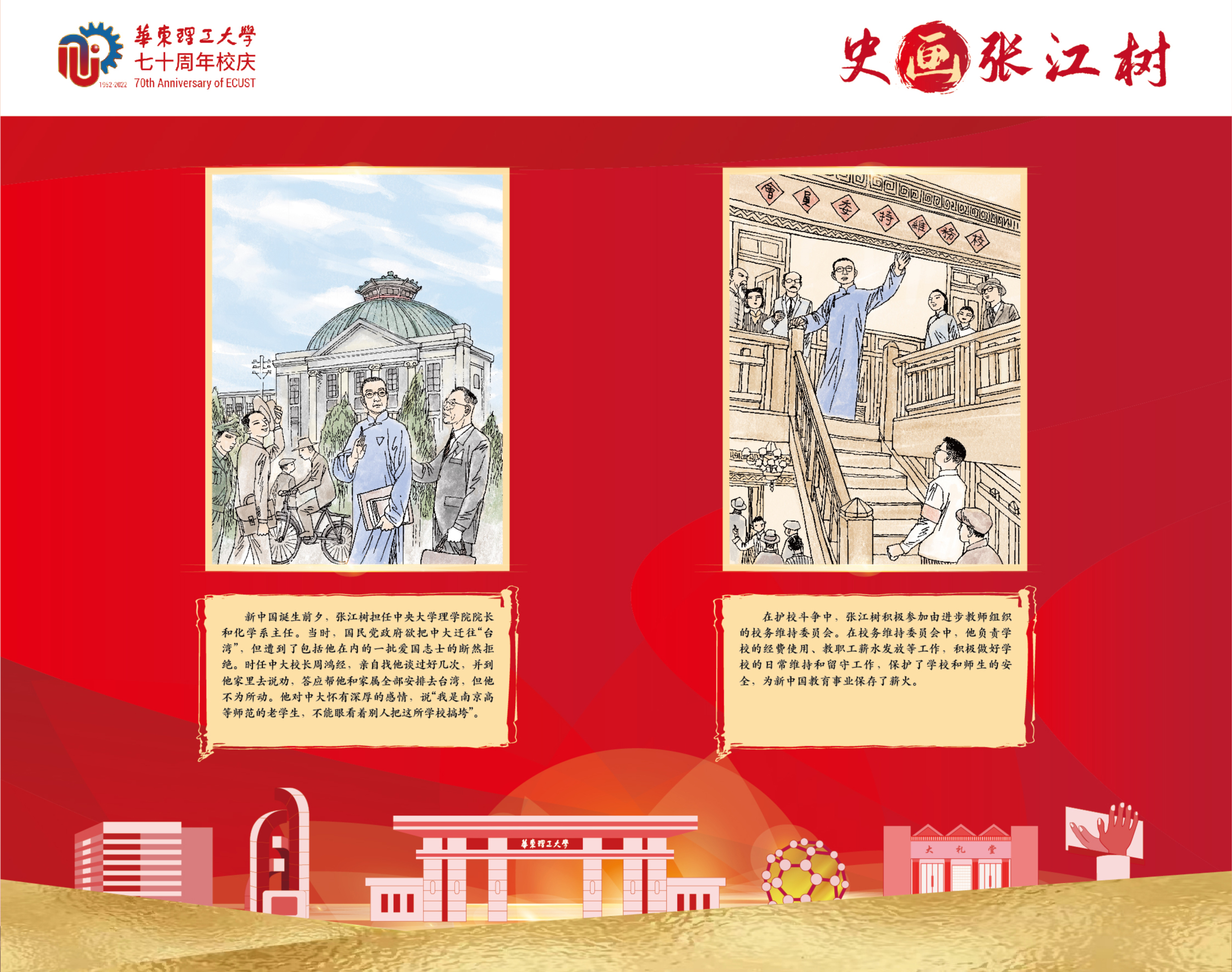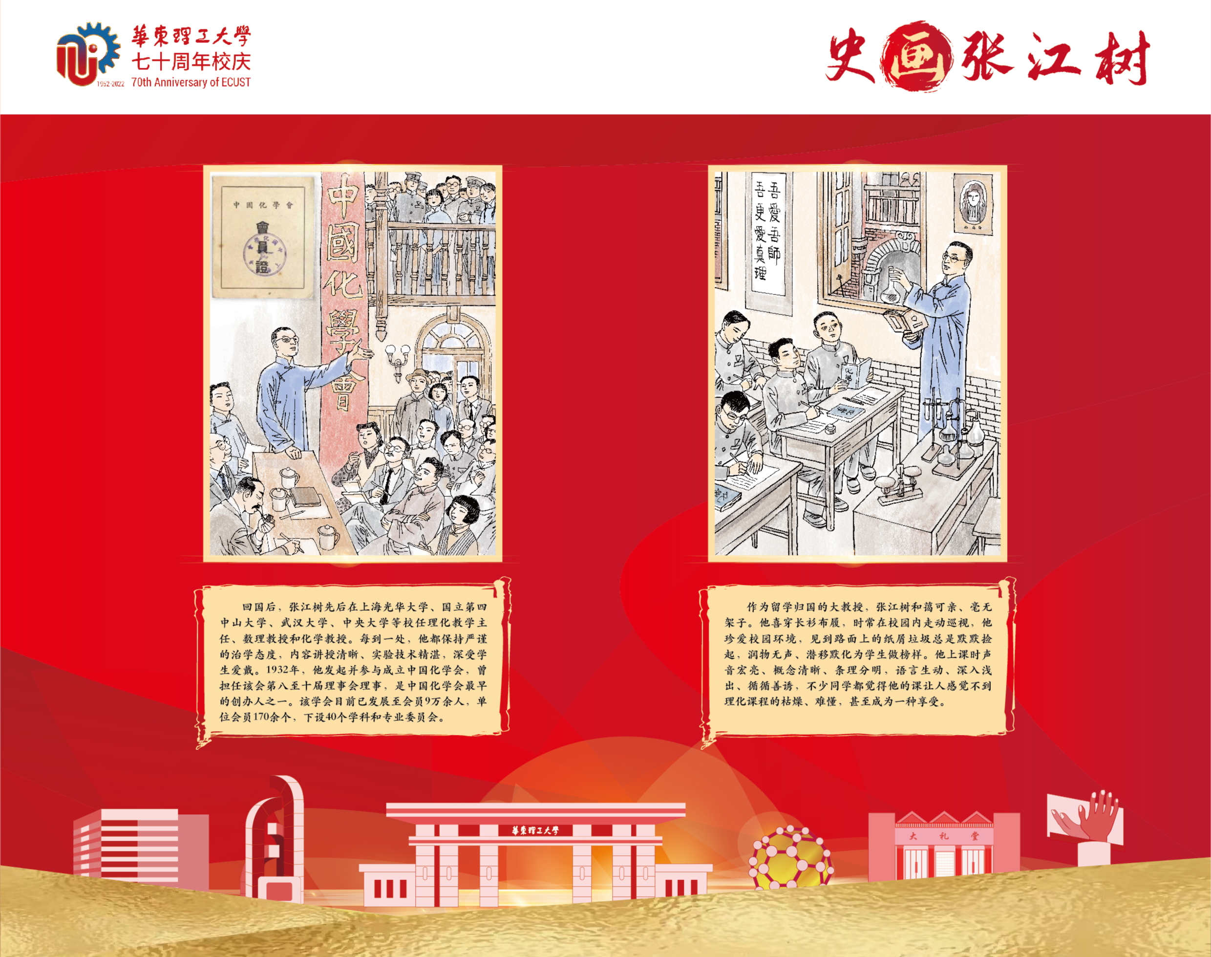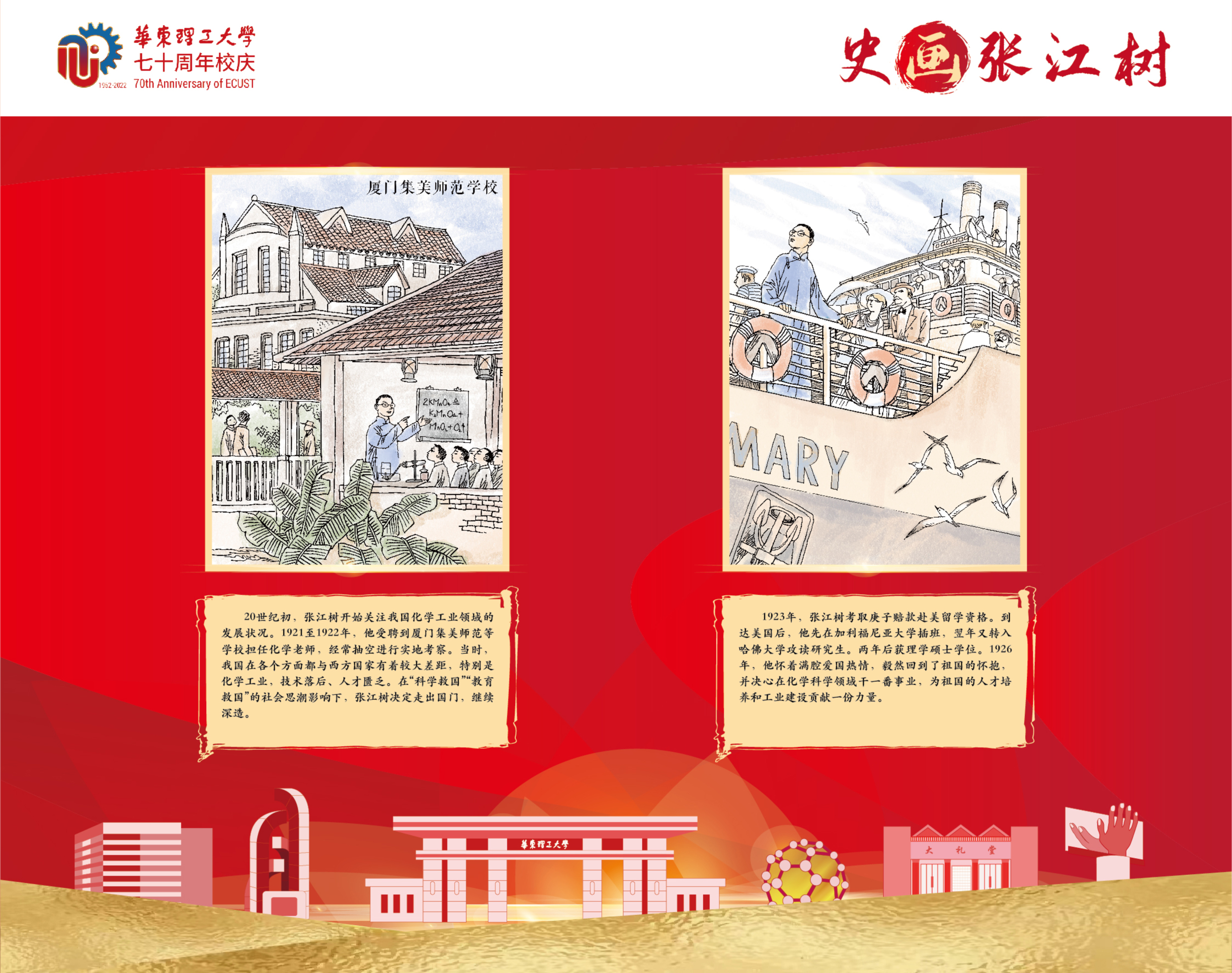 本次展览以学校首位校长张江树先生的生平为线索,用连环画的笔触,图文并茂地介绍了他求学、育人和治校的经历,阐述了他“德性宜笃实也,知识宜富实也,身体宜健实也”的教育理念,展示了他为国家教育与化学化工事业不懈奋斗的一生。据悉,本次展览除实体形式外,还采用微信推送等线上方式全渠道立体式为校庆活动持续预热。