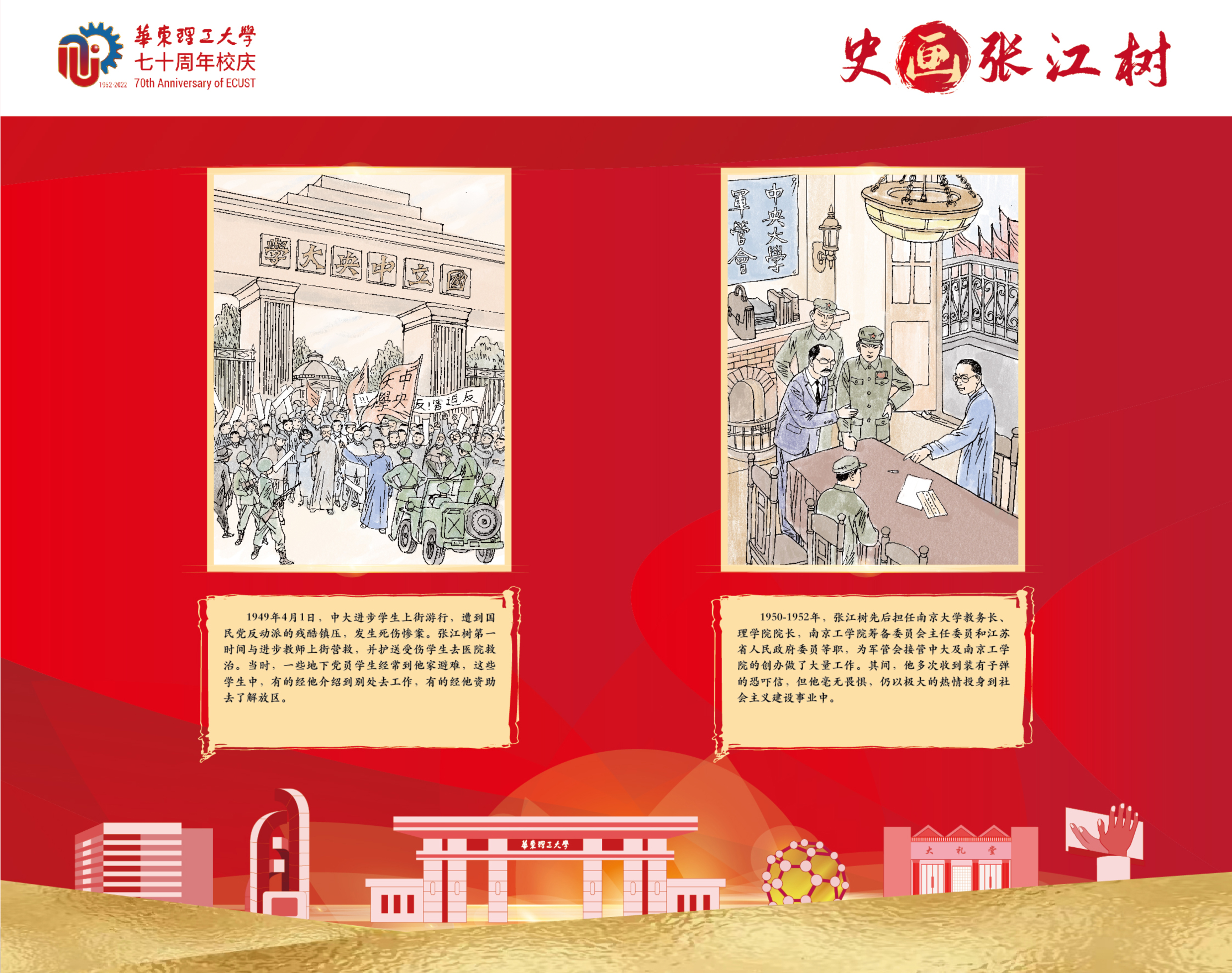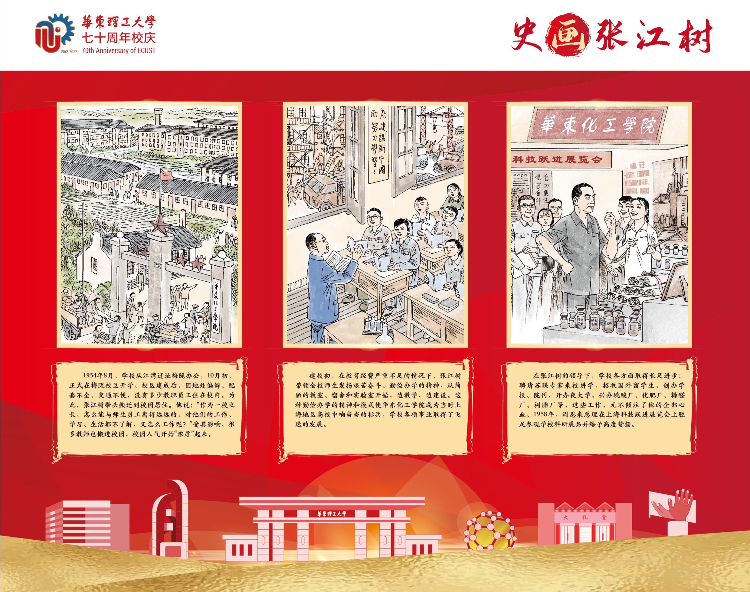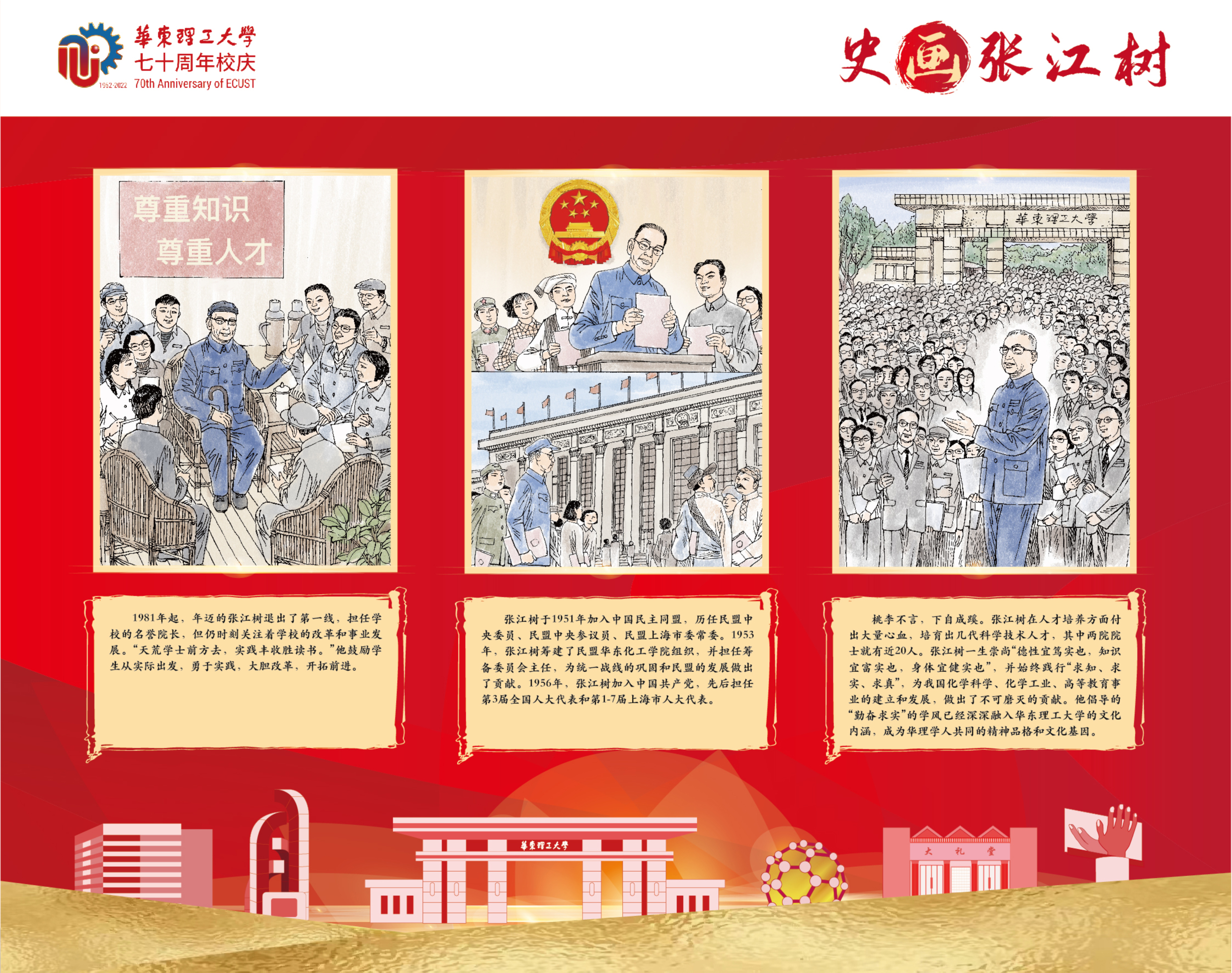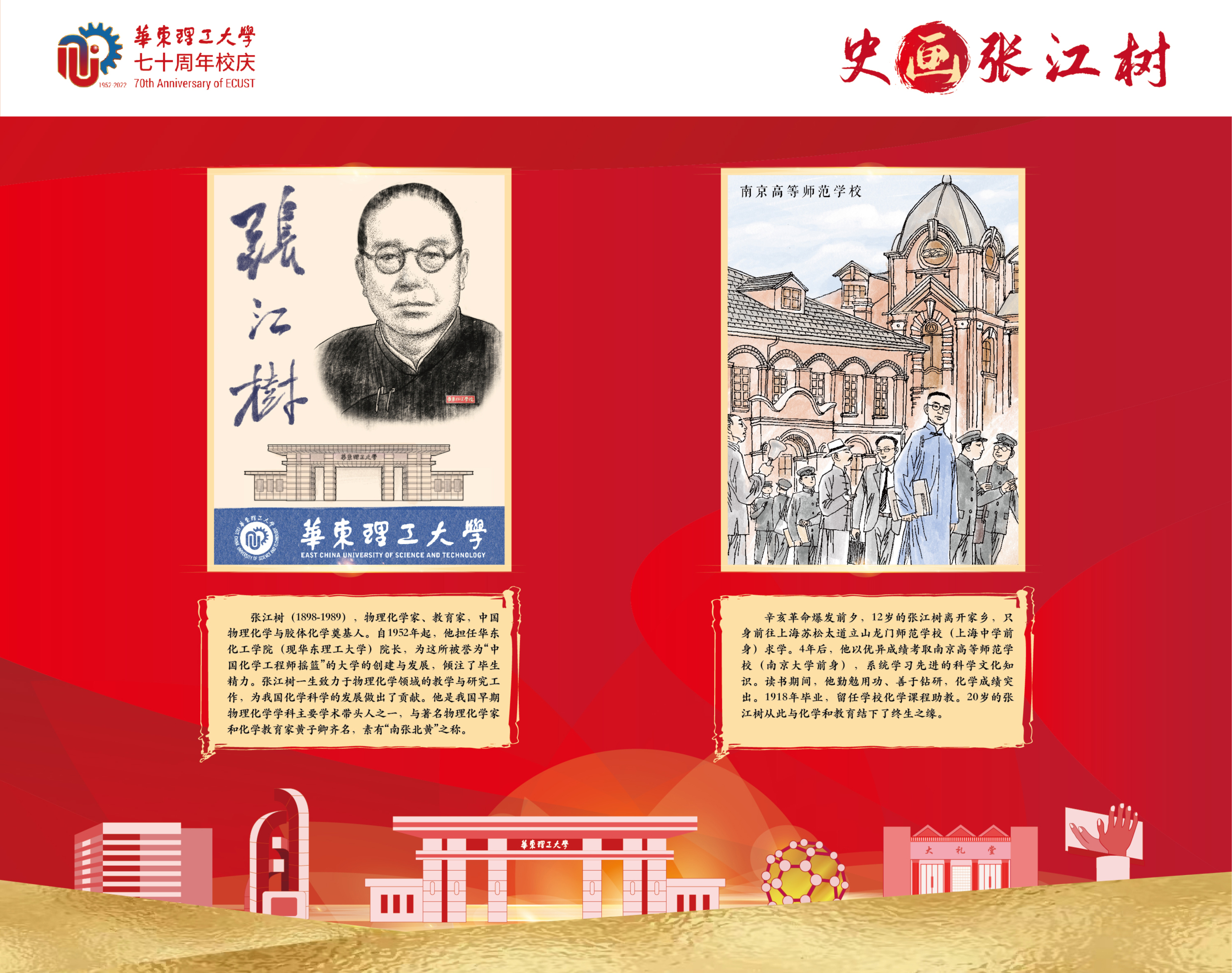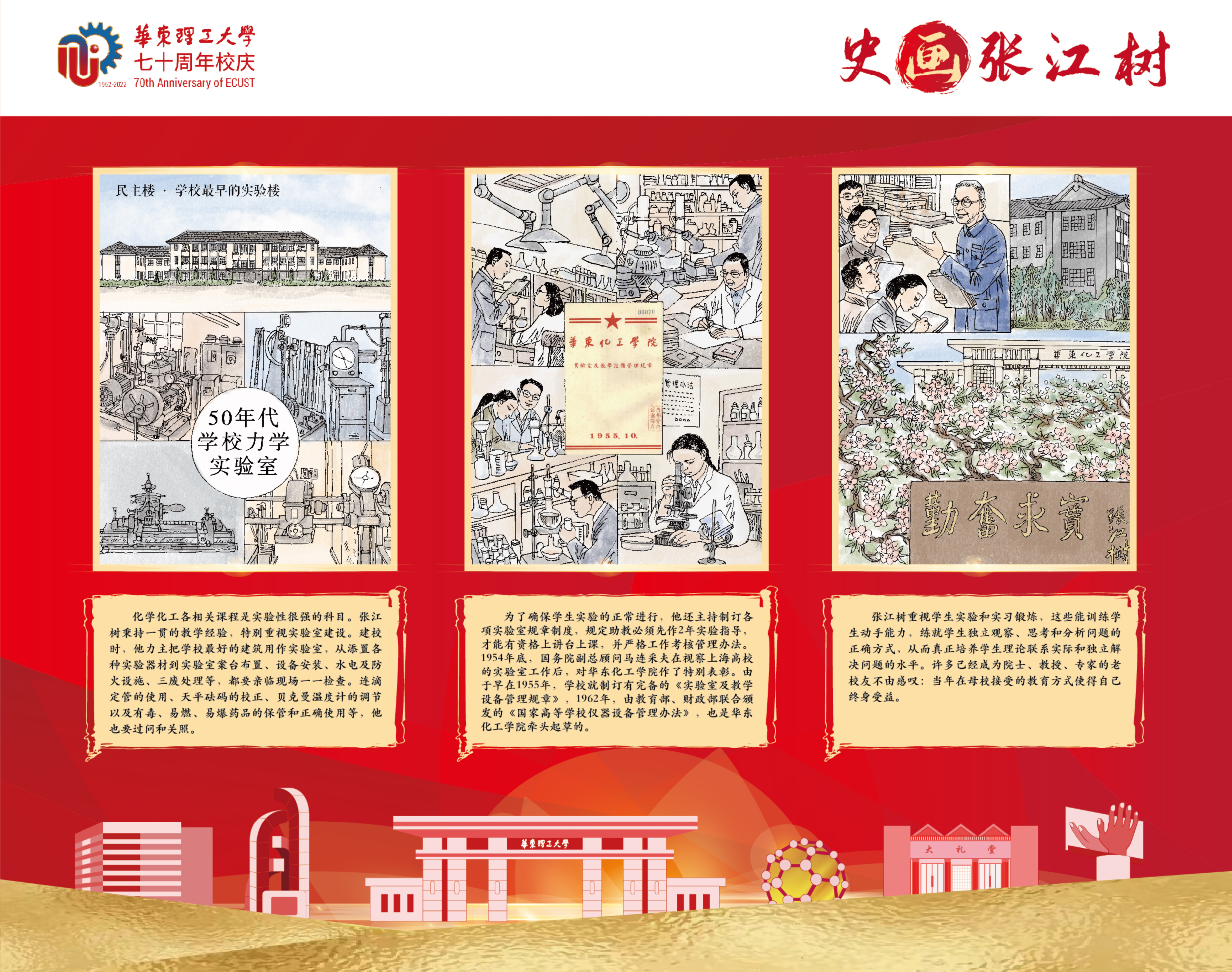本次展览以学校首位校长张江树先生的生平为线索,用连环画的笔触,图文并茂地介绍了他求学、育人和治校的经历,阐述了他“德性宜笃实也,知识宜富实也,身体宜健实也”的教育理念,展示了他为国家教育与化学化工事业不懈奋斗的一生。据悉,本次展览除实体形式外,还采用微信推送等线上方式全渠道立体式为校庆活动持续预热。