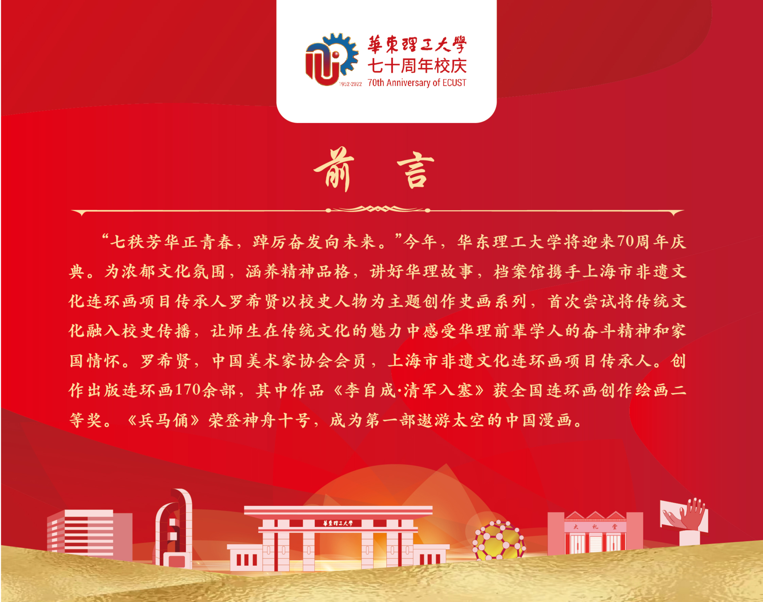 近年来,档案馆在校史传播模式方面持续发力。“非遗+校史”即是一次推动校园文化美育,弘扬传统文化的创新尝试。2021年,档案馆在广泛调研的基础上,经专家推荐和深入走访,选择了上海市非遗文化连环画项目传承人罗希贤团队,并以校史人物为主题开展史画系列的创作实践。罗希贤是中国美术家协会会员,先后创作出版连环画170余部,其中作品《李自成·清军入塞》获全国连环画创作绘画二等奖。《兵马俑》荣登神舟十号,成为第一部遨游太空的中国漫画。