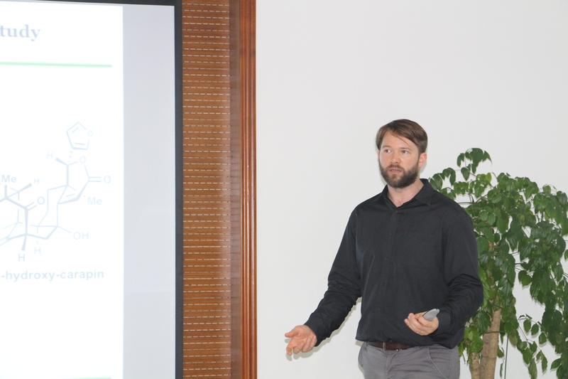 At the invitation of Prof. Zhu Weihong, Dean of the School of Chemistry and Molecular Engineering, ECUST, Prof. Timothy R. Newhouse and Dr. Chen Yifeng from Department of Chemistry of Yale University came to ECUST for academic exchanges  on Oct. 21st. 2016.  Professor Timothy R. Newhouse delivered an academic report entitled “Mechanism-Based Methods Development for Synthesis of Neurologically Active Natural Products”.  The report meeting was chaired by Prof. Zhu Weihong, and joined also by Prof. Wu Xinyan, Prof. Cai Liangzhen and other teachers of the Organic Chemistry Teaching and Research Group.