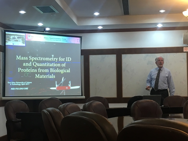 At the invitation of the School of Resources and Environmental Engineering, Prof. Bruce and Dr. Sun Dongxiao (Alumni of East China University of Science and Technology) from the Faculty of Medicine, Pennsylvania State University, paid a visit to ECUST on April 5th, 2017. They made an academic report entitled “Mass Spectrometry for ID and Quantitation of Proteins from Biological Materials”, which was attended by graduate students and teachers from the School of Resources and Environmental Engineering.