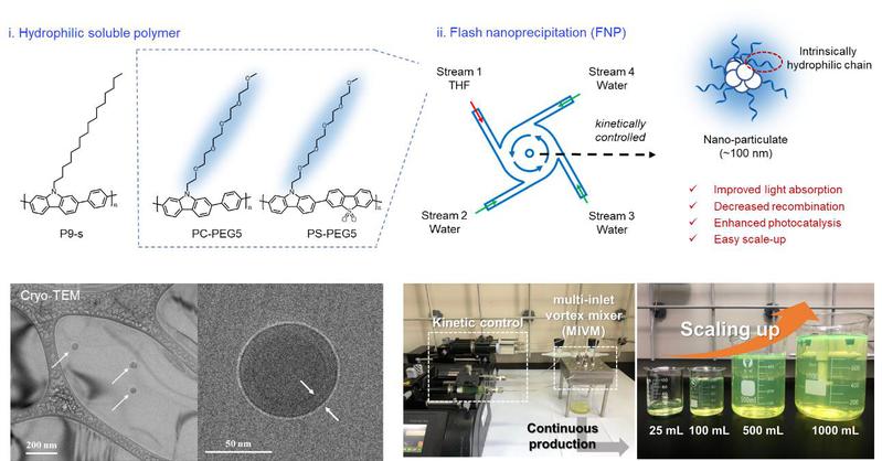 Recently, the research team of Professor Zhu Weihong introduced FNP to prepare organic nano-photocatalyst for the first time, developed hydrophilic soluble conjugated polymer through molecular engineering, and obtained organic nano-photocatalyst aqueous solution with uniform dispersion and stable properties with FNP method. The research article was published in Angew. Chem. Int. Ed. under the title of “Engineering Nanoparticulate Organic Photocatalysts via a Scalable Flash Nanoprecipitation Process for Efficient Hydrogen Production”.