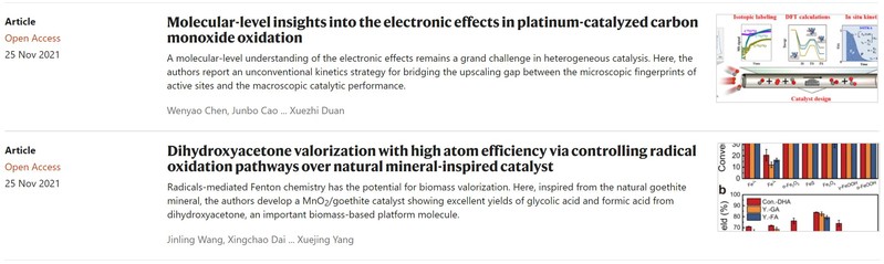 These two articles respectively reported the progress of Professor Duan Xuezhi, Dr. Chen Wenyao and Academician DeChen of Norwegian University of Science and Technology in the design of catalyst guided by reaction kinetics, and the progress of Yang Xuejing, a researcher of Institute of Mobility, Wang Jinling, a doctoral student of Institute of Chemical Engineering, and Angelika Brückner, a professor of catalysis research institute in Leibniz, Germany, in the activation of C-C bond free radicals of biomass platform molecules and the controllable transformation of high atom economy. Academician Yuan Weikang, Professor Zhou Xinggui, Professor Liu Honglai, Professor Wang Hualin of the Joint State Key Laboratory of Chemistry participated in the above work and provided important support and guidance.