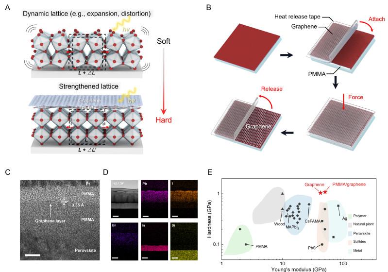 Professor Hou Yu and Professor Yang Shuang from the research team of clean energy materials and devices of School of Materials, East China University of Science and Technology published their latest research article entitled “Graphene-Polymer Compensation of Perovskite Lattices for Durable Solar Cells” in Science on March 7th, 2025. This study found the key mechanism of perovskite photovoltaic instability-photo-mechanical induced decomposition effect, and put forward a new method of graphene-polymer mechanical reinforcement of perovskite materials enabling the T97 working life of the prepared solar cell device under standard solar illumination and high temperature reached a new record of 3670 hours, and the research article will provide a new solution for the industrial application of perovskite solar cells.