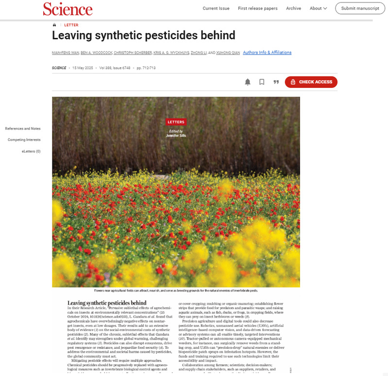 Recently, Professor Wan Nianfeng from the research team of Academician Qian Xuhong, ECUST, collaborating with researchers from East China Normal University and institutions in the UK, Germany, and Australia, published an academic Letter titled “Leaving synthetic pesticides behind” in Science.
